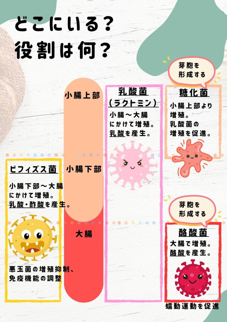・乳酸▶腸内を弱酸性に保ち、悪玉菌の増殖を抑える