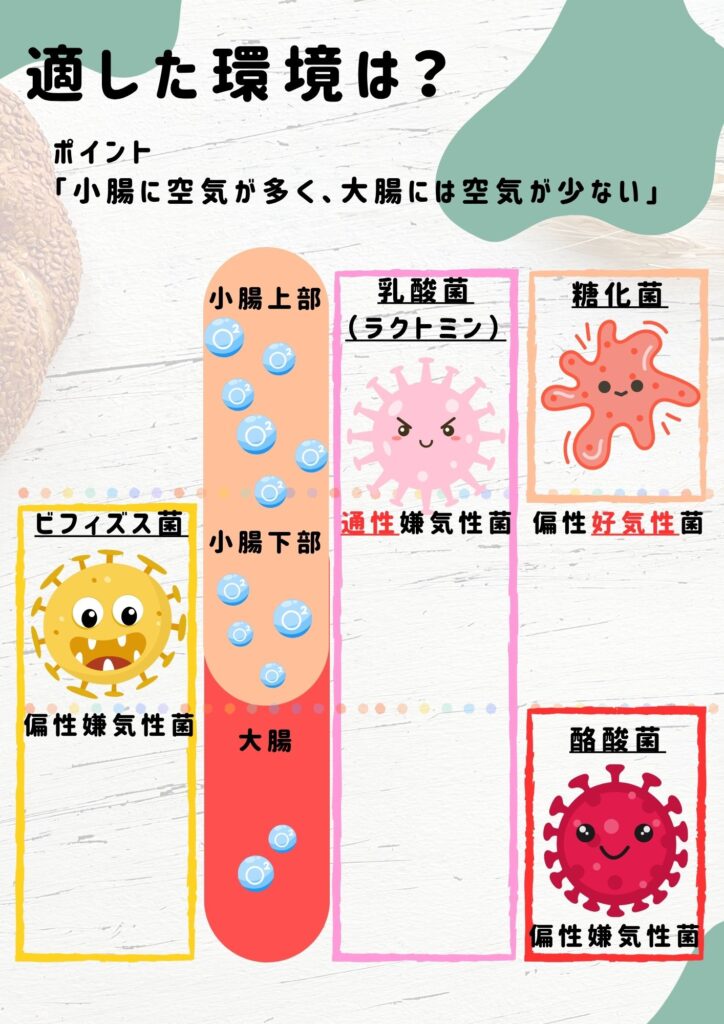 口に近い小腸上部では酸素が多いですが、大腸に進むにつれて酸素が減っていきます。