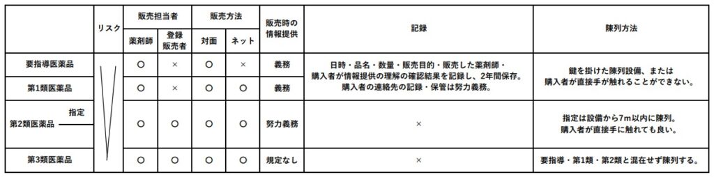 この表で「要指導医薬品」や「第1類医薬品」が厳しく規制していることがわかります。