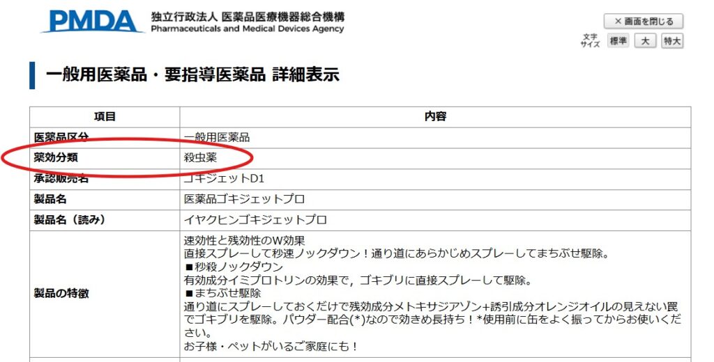 薬効では「48)殺虫薬」に分類された「ゴキジェット」を見てみましょう。