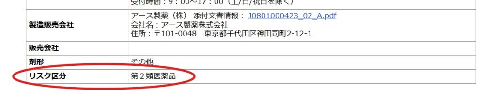 こちらには「薬効分類」と「リスク区分」と記載されているのでわかりやすいかと思います。