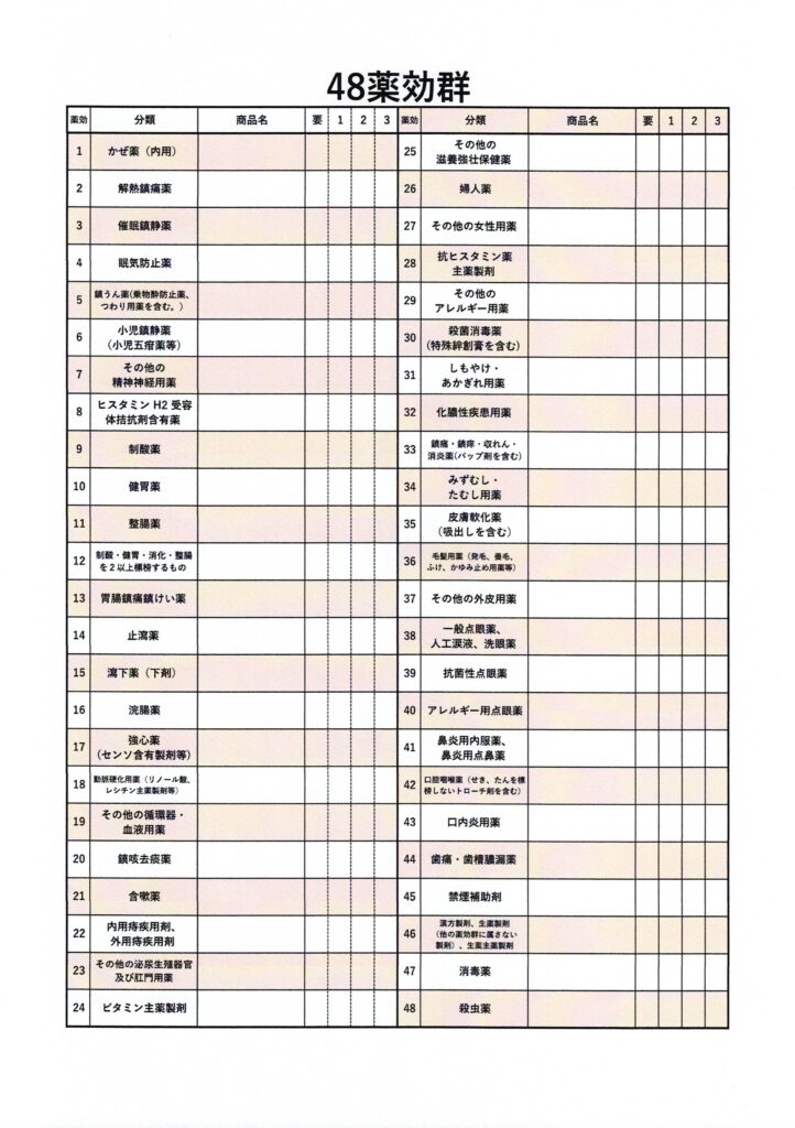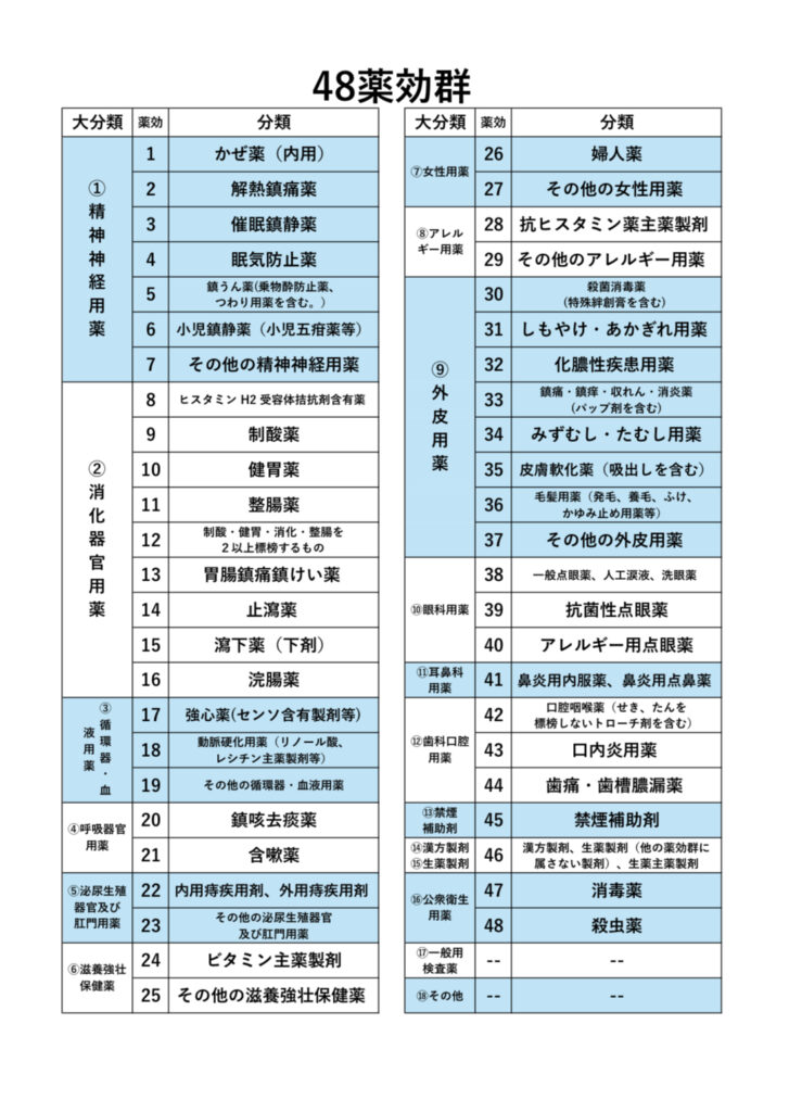 薬局に置いてある市販薬は48薬効群のどれに当てはまるのでしょうか。