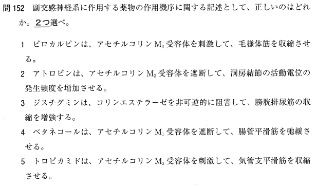 5:× トロピカミドはM3受容体を「遮断」して散瞳(瞳孔を開く)させます。刺激はしません。