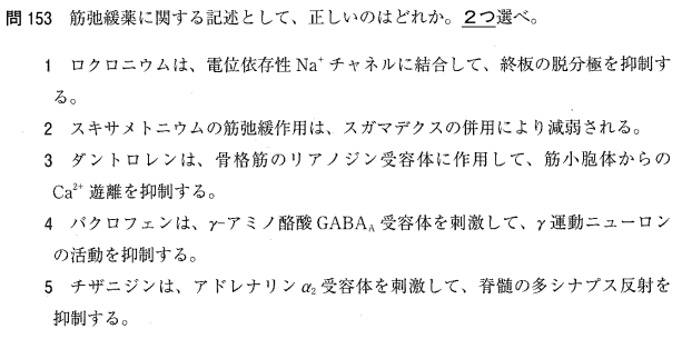 1:× ロクロニウムはアセチルコリンNm受容体を遮断します。Na+チャネルに結合するのは局所麻酔薬などの機序です。