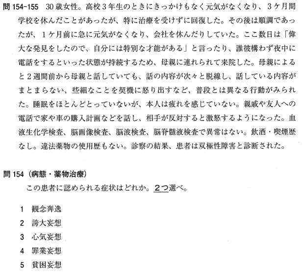 3:× 心気妄想はうつ病の三徴の一つであり、本症例の躁状態とは一致しません。