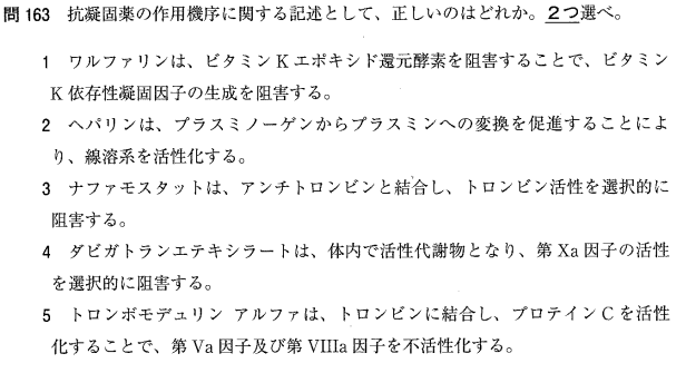 2:× ヘパリンはアンチトロンビンの作用を強めます。プラスミノーゲンをプラスミンに変えるのはウロキナーゼ等です。