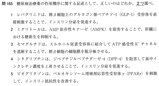 1:× レパグリニドはSU受容体に結合します。GLP-1受容体を刺激するのはセマグルトイド等です。