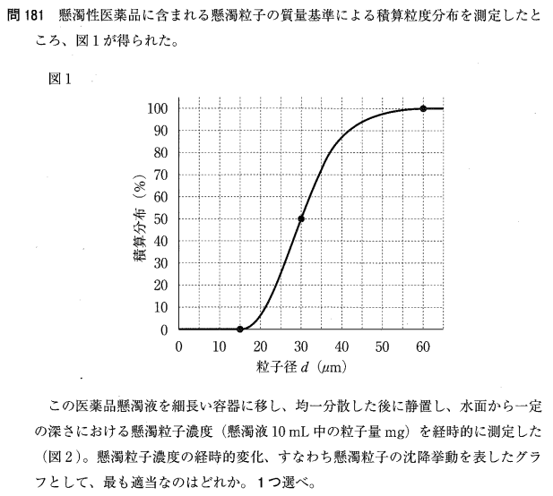 また、t=4 ht = 4\ \text{h} のとき:dlimit=30 μmd_{limit} = 30\ \mu\text{m}。グラフ 1 より F(30)=50%F(30) = 50\% なので、濃度は 12×0.5=6 mg/10 mL12 \times 0.5 = 6\ \text{mg/10 mL} です。