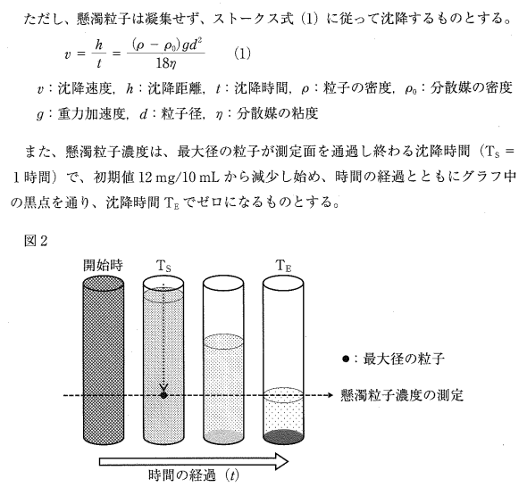 TST_S (最大粒子の沈降時間): グラフ 1 より最大粒子径 dmax=60 μmd_{max} = 60\ \mu\text{m} です。問題文より TS=1T_S = 1 時間とされています。