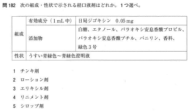 3:○ エリキシル剤は、甘味と芳香があり、エタノールを含む澄明な経口液剤です。ジゴキシンエリキシルが代表例です。