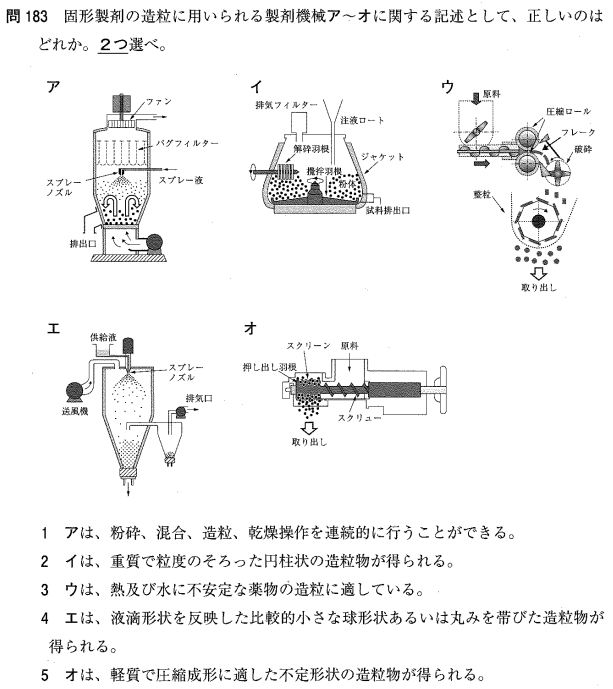 3:○ 装置ウ(破砕造粒機)は水や熱を使わない乾式造粒のため、これらに不安定な薬物に適します。