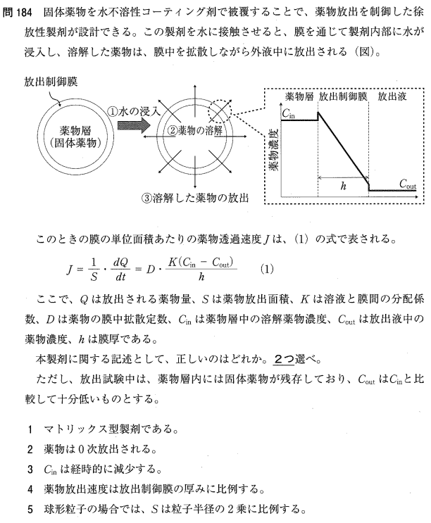 2:○ 固体薬物が残存している間は膜内外の濃度差が一定に保たれるため、0次放出(一定速度での放出)となります。