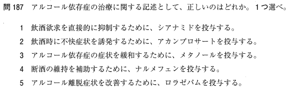 1:× シアナミドは飲酒時に不快な症状を起こさせる抗酒薬です。飲酒欲求を抑えるのはアカンププロサートです。