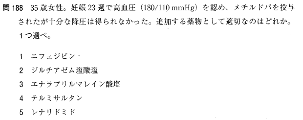 1:○ 妊娠中の高血圧に対し、メチルドパで不十分な場合はニフェジピン(カルシウム拮抗薬)が追加薬として選択されます。