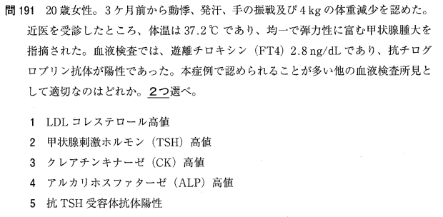 2:× 甲状腺ホルモンによる負のフィードバックで、TSH(甲状腺刺激ホルモン)は「低値」となります。