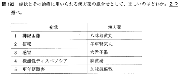 1:○ 八味地黄丸は、高齢者の排尿困難や頻尿などの泌尿器症状に用いられます。