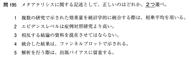 2:○ メタアナリシスは、個別の臨床研究(症例対照研究など)を統合したものであり、エビデンスレベルが最も高いです。