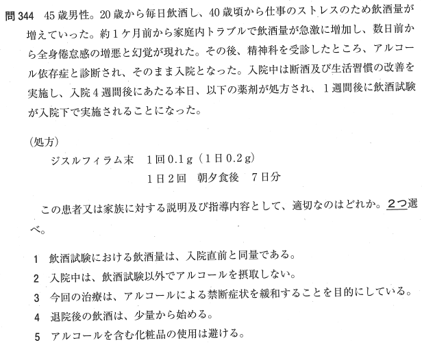 4:× 依存症の場合、一度でも飲むと元の状態に戻ってしまうリスクが高いため、退院後も「少量から始める」のではなく、完全な断酒を継続するよう指導します。