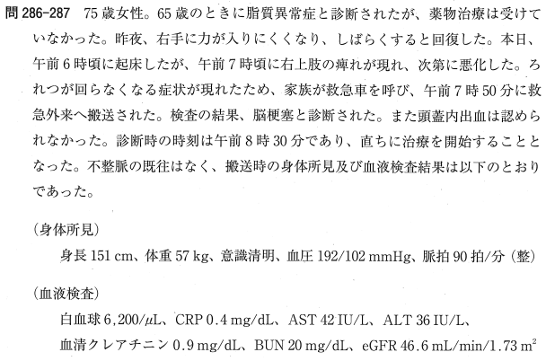 1:○ 発症から4.5時間以内ですあり、血栓溶解薬を使用する可能性があります。ただし、アルテプラーゼ(遺伝子組換え)静注療法は、収縮期血圧185 mmHg以上または拡張期血圧110 mmHg以上の患者には頭蓋内出血リスクが高いため降圧を行いつつ使用するのが望ましいです。