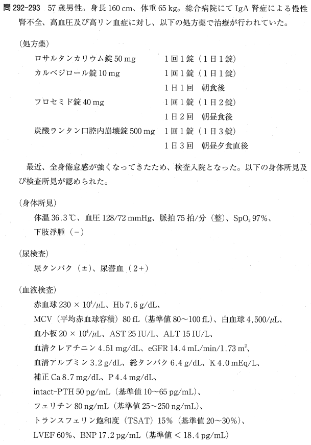 5:○ Hb値が 7.6 g/dL と著しく低下しており、腎性貧血の治療介入が必要です。造血を促進するHIF-PH阻害薬であるロキサデュスタット錠を追加することは、本患者の病態に応じた適切な処方提案です。