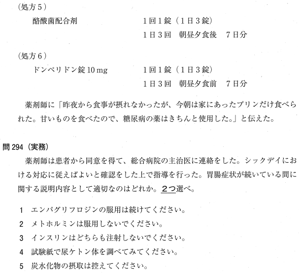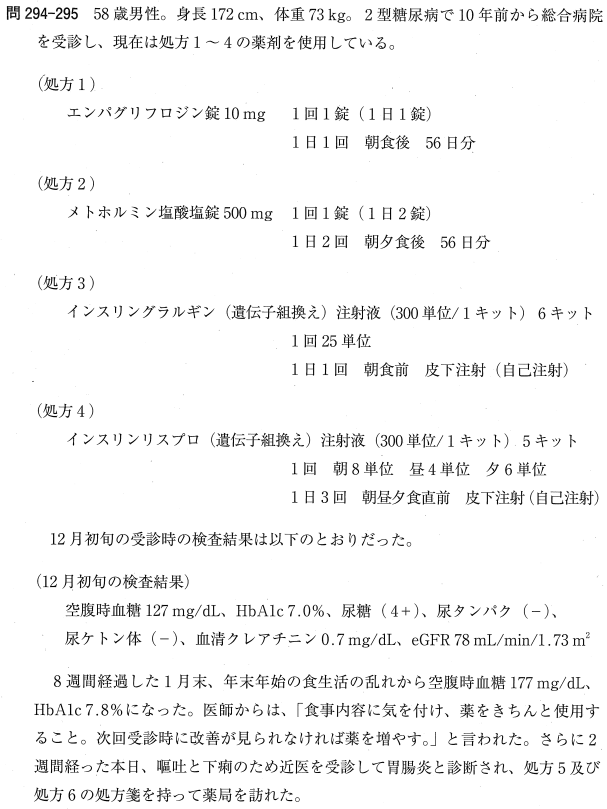 5:× 患者はシタグリプチン(DPP-4阻害薬)を服用しており、空腹時血糖とHbA1cの値からも糖尿病であると判断できます。クエチアピンフマル酸塩は、著しい血糖値の上昇から糖尿病性ケトアシドーシス等を起こすリスクがあるため、糖尿病患者には禁忌です。