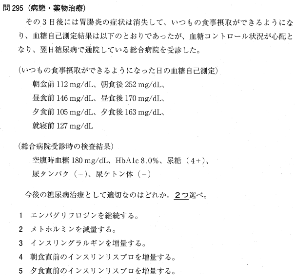 3:× 血糖自己測定(SMBG)の結果を見ると、朝食前112 mg/dL、夕食前105 mg/dL、就寝前127 mg/dLと、基礎インスリンが担う空腹時・食前の血糖値は比較的良好にコントロールされています。ここで基礎インスリンであるインスリングラルギンを増量すると、低血糖を招くおそれがあるため不適切です。(※受診時の空腹時血糖180 mg/dLは単回の一過性上昇の可能性が高く、持続的なSMBGの記録を優先して評価します)
