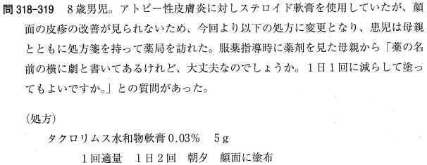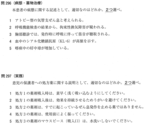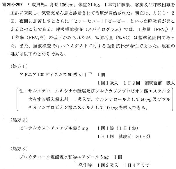 2:× 処方1の薬剤には副腎皮質ステロイド(フルチカゾン)が含まれています。口腔内に付着したステロイドによる局所的な副作用(口腔カンジダ症や嗄声など)を予防するため、吸入後は必ず「うがい」をするように指導します。