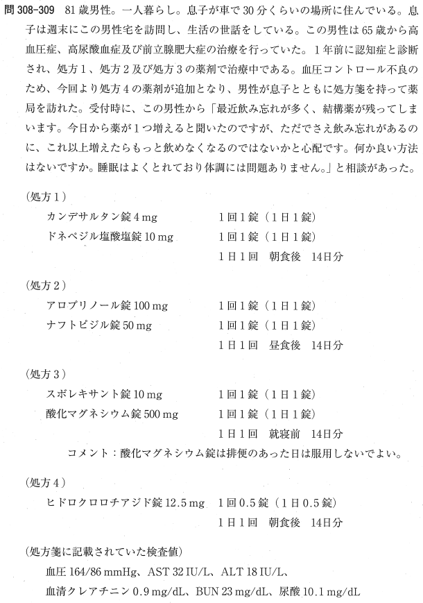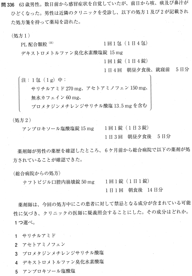 1:× サリチルアミドは解熱鎮痛成分であり、本患者の持病(前立腺肥大症)に対して直接の禁忌ではありません。
