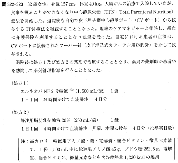 1:○ 高カロリー輸液(処方1)にはビタミン剤が配合されています。ビタミンB2などは光によって分解されやすいため、変質を防ぐために遮光カバーでバッグを覆って投与する必要があります。