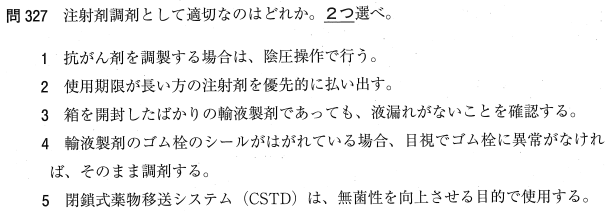 4:× フルオロウラシル(5-FU)は、生理食塩液やブドウ糖注射液のどちらに混ぜても安定しており、配合変化による沈殿などは起こりません。混和を避ける必要はありません。