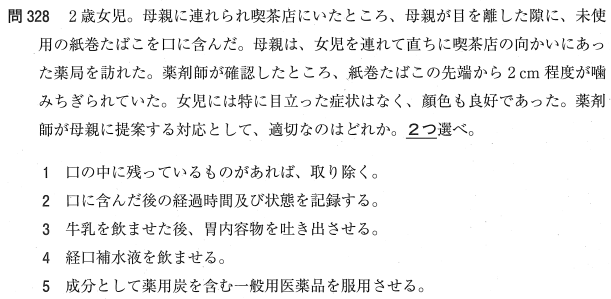 5:× 処方2のデノタス「チュアブル」配合錠は、その名の通り、かみ砕くか、口中で溶かして服用する剤形です。そのまま飲み込むと消化管での崩壊・吸収が不十分になる可能性があるため、そのまま服用させる指導は誤りです。