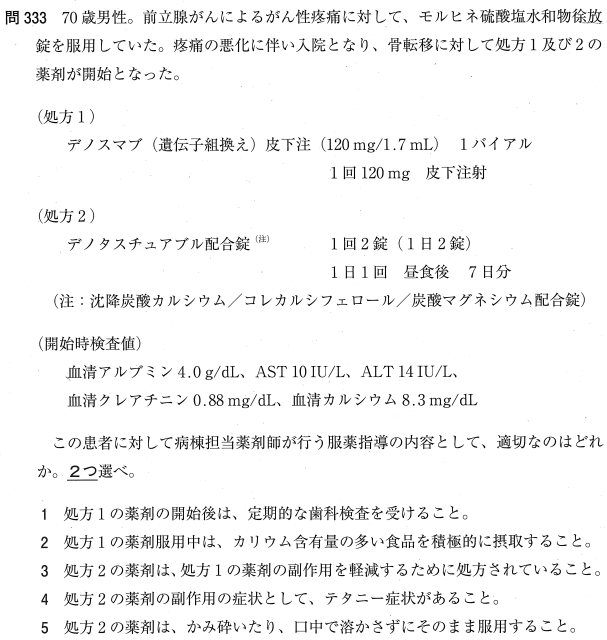 4:× テタニー(手指のしびれや筋肉の痙攣など)は「低カルシウム血症」の症状です。処方2の薬剤はカルシウムを補充する薬であるため、副作用として懸念されるのはテタニーではなく、過剰摂取による「高カルシウム血症」です。