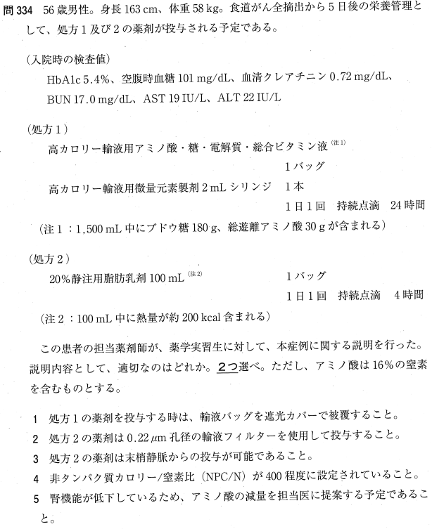 3:○ 脂肪乳剤は浸透圧が血漿とほぼ等しく(等張に近い)、血管への刺激が少ないため、末梢静脈からの投与が可能です。