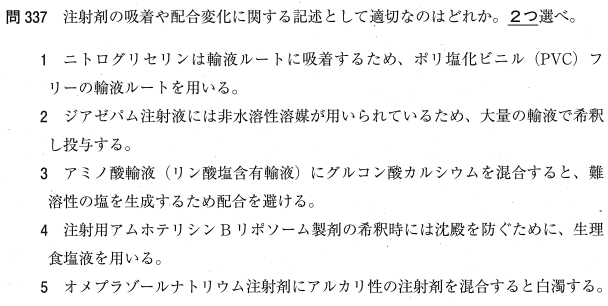 3:○ リン酸塩を含む輸液(アミノ酸輸液など)にグルコン酸カルシウムなどのカルシウム製剤を混合すると、難溶性の「リン酸カルシウム」が生成され、沈殿や白濁が生じます。特に高カロリー輸液(TPN)の調製において注意すべき配合変化です。