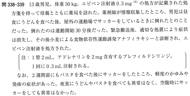 1:× 食物依存性運動誘発アナフィラキシー(FDEIA)は、特定の食品(本症例では小麦)の摂取と、その後の運動が組み合わさることで発症します。屋内・屋外といった場所は関係ありません。