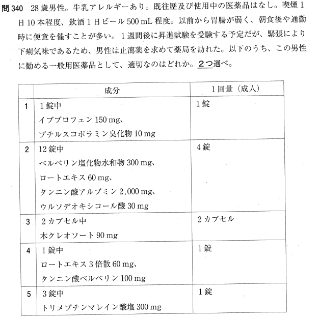 2:× タンニン酸アルブミンは牛乳由来の成分を含んでいます。この男性には「牛乳アレルギー」があるため、ショック症状などを起こす危険があり、絶対に勧めてはいけません。