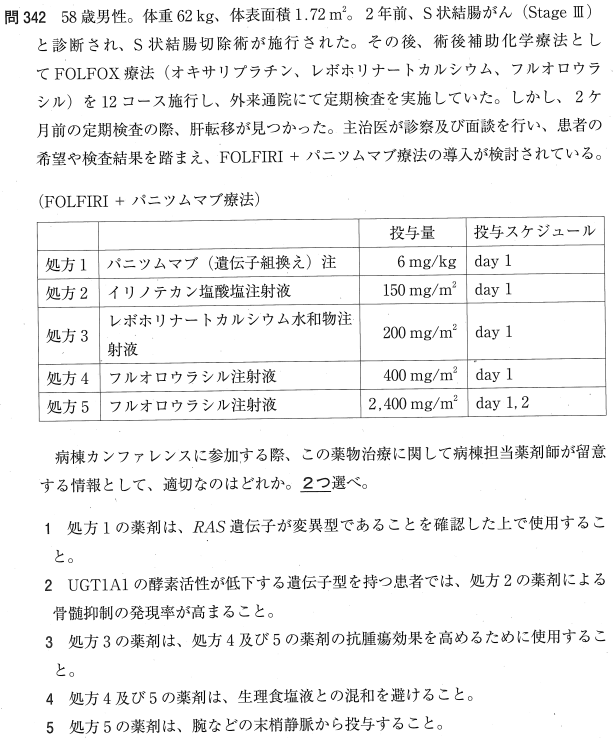 1:× パニツムマブ(抗EGFR抗体)は、RAS遺伝子が「野生型(変異がないタイプ)」の大腸がんにのみ効果があります。遺伝子に変異がある場合には効果が期待できないため、変異型であることを確認して使用するのは誤りです。