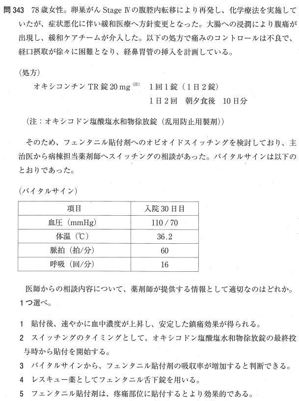 3:× 貼り薬からの吸収量は「体温が上がったとき」に増えます。この患者の体温は36.2度と平熱であるため、バイタルサインから吸収量が増加すると判断することはできません。