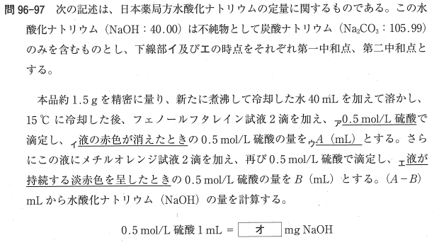 5:× 0.5 mol/L 硫酸 1mLは 1mmolの H+を含みます。これは 1 mmol の NaOHと反応します。NaOHの分子量は 40.00 なので、正しくは 40.00mgです。