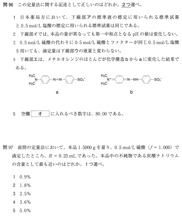 1:○ 日本薬局方において、硫酸および塩酸の標定には、いずれも標準試薬として炭酸ナトリウムが用いられます。