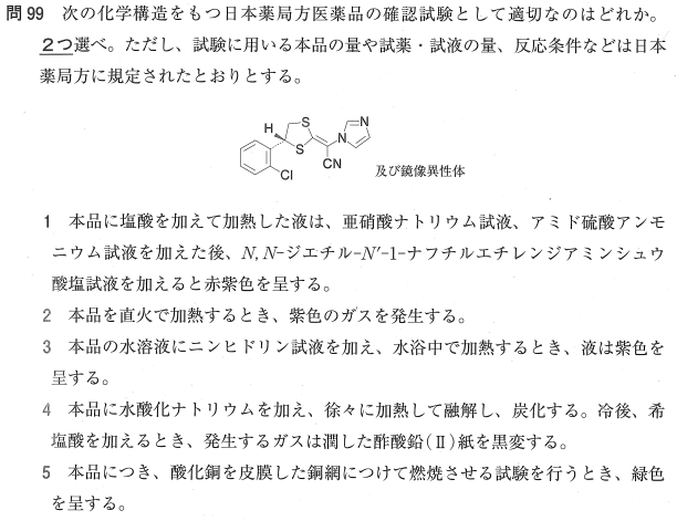 2:× ヨウ素の昇華(紫色ガス)を確認する試験ですが、構造中にヨウ素は含まれません。