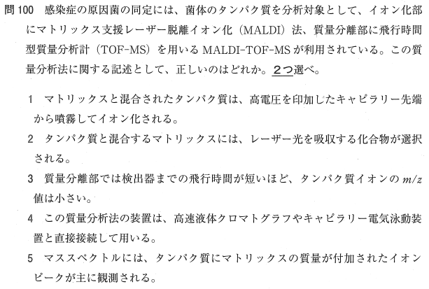 1:× 高電圧を印加したキャピラリーから噴霧するのは ESI(エレクトロスプレーイオン化)法の説明です。
