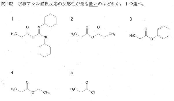 プロピオニル基($CH_3CH_2CO-$)に結合した脱離基の質による、求核アシル置換反応の反応性を問う問題である。