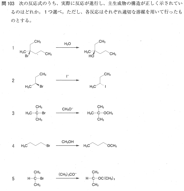 4:× 1級ハロゲン化アルキルとメタノール(弱求核剤)の反応です。1級カチオンは不安定なため SN1 は進行せず、また は求核性が低いため SN2も極めて遅いです。通常、この条件では反応は殆ど進行しません。
