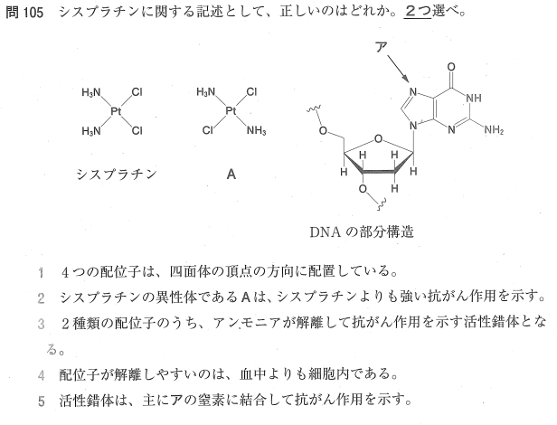 2:× 異性体A(トランスプラチン)は、シスプラチン(シス体)に比べて抗がん作用が著しく低いです。