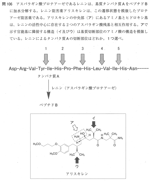 5:○ アリスキレンの構造において、(イ)はイソプロピル基を有するバリン、(ウ)はイソブチル基を有するロイシンの側鎖を模倣しており、中央の(ア)がその切断部位の遷移状態を模倣しています。配列中のLeu-Valの間を指す矢印「5」が正解です。