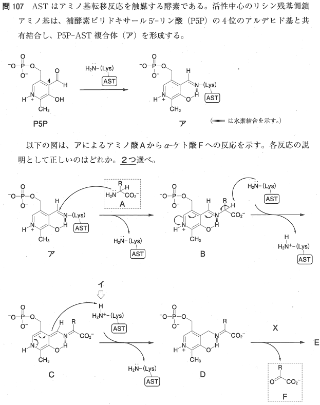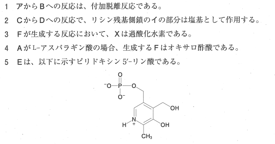 5:× Eの構造はピリドキシンとなっていますが、この反応で生成するのは4位がアミノメチル基になった「ピリドキサミン 5′-リン酸(PMP)」です。