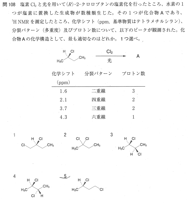 5:○ 1.6 ppm(二重線)、2.1 ppm(四重線)、3.7 ppm(三重線)、4.3 ppm(六重線)のデータは「1,3-ジクロロブタン」の構造と完全に一致します。
