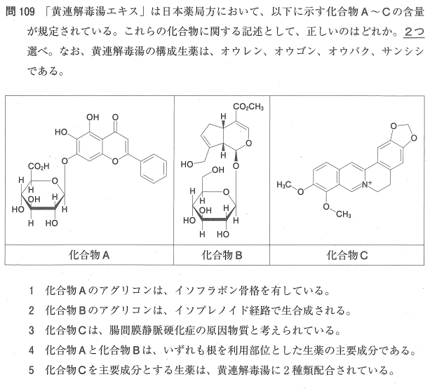 5:○ 化合物C(ベルベリン)は、黄連解毒湯の構成生薬のうち「オウレン」と「オウバク」の2種類に含まれます。