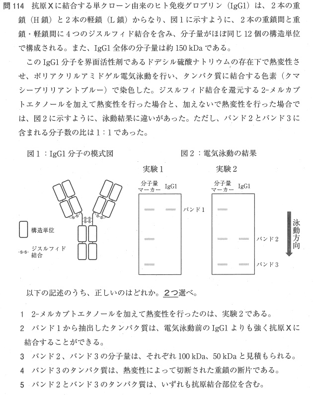 1:○ 実験2では2-メルカプトエタノール(還元剤)を加えたことで、H鎖とL鎖を繋ぐジスフィド結合が切断されています。